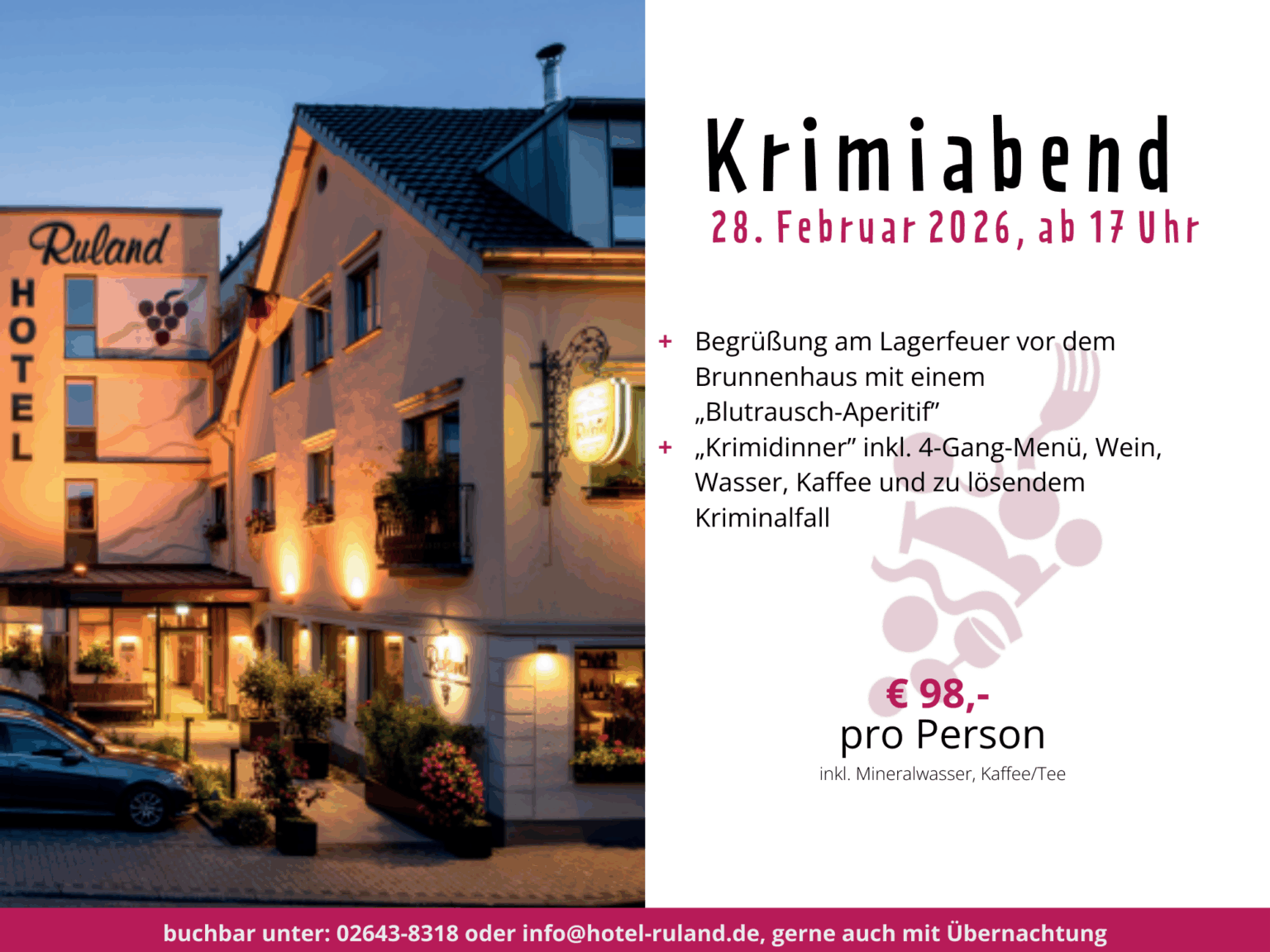 + „Krimidinner” inkl. 4-Gang-Menü, Wein, Wasser, Kaffee und zu lösendem Kriminalfall